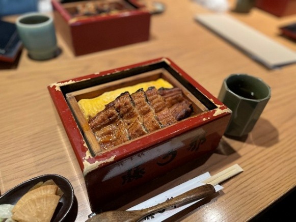 もち米を使ったご飯に、うなぎと出し巻き卵がのった珍しいうな重は、たれがよく絡み、皆大満足でした。