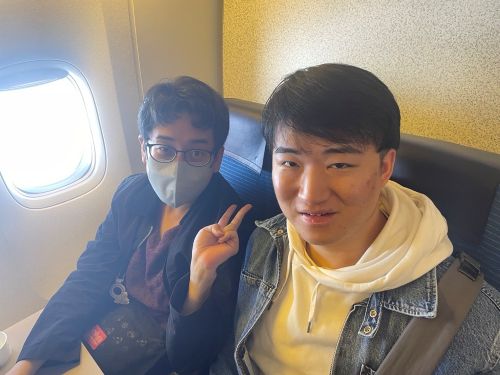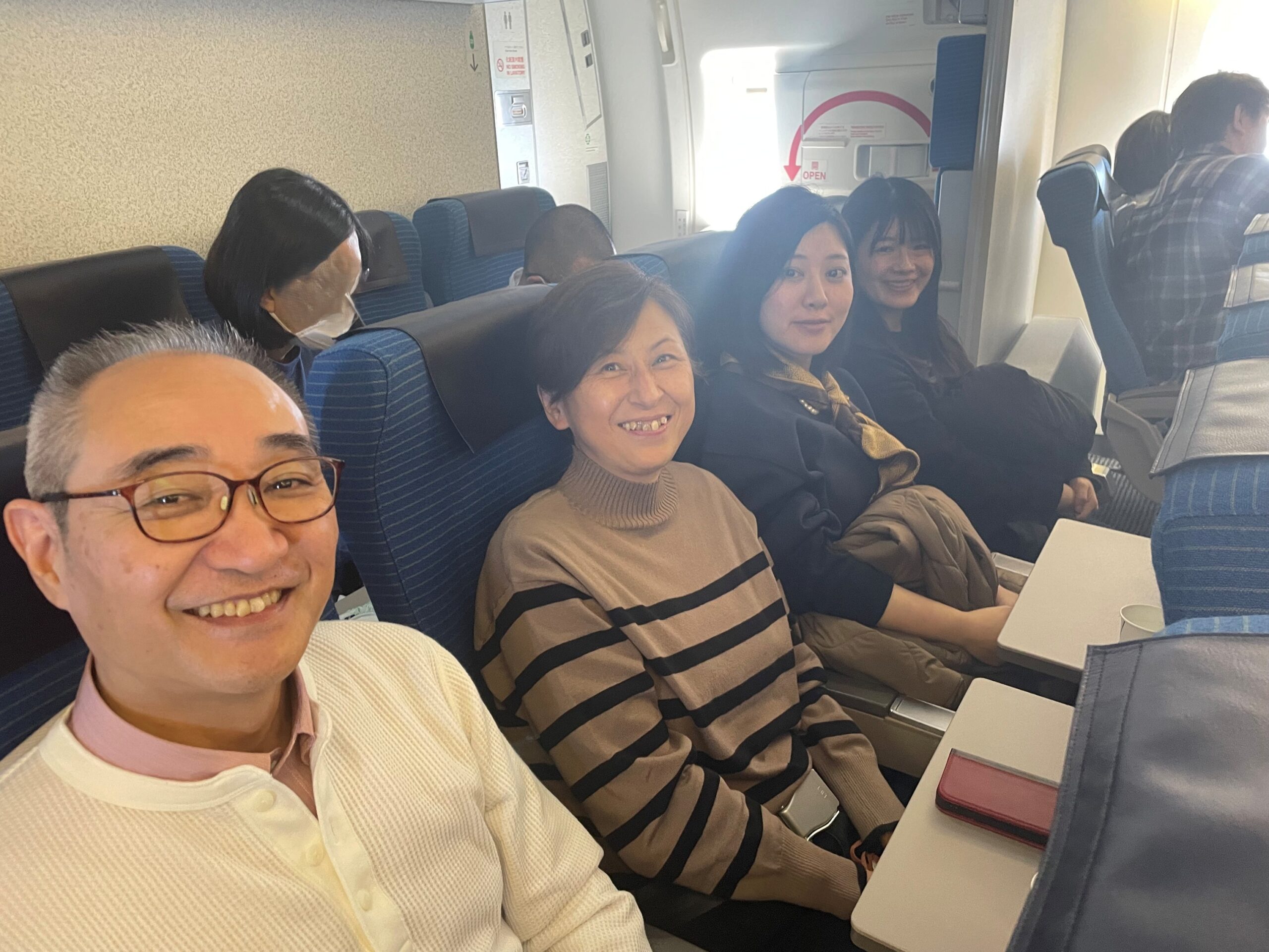 機内では社員同士横並びの席順だったため、近くの席の社員同士で会話を楽しみながら過ごしました。