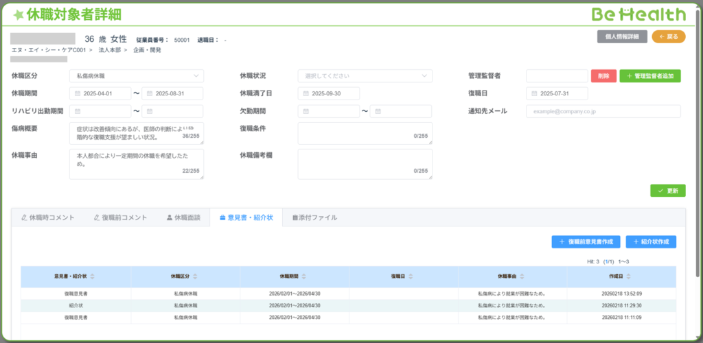 本機能を活用することで、休職・復職に関する従業員情報の一元管理が実現するとともに、医療専門職が適切な時期に関わることができる環境を整えることができます。
